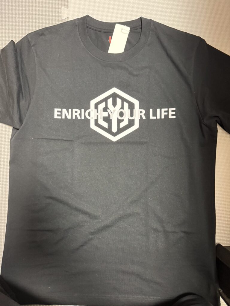 今回は、プレゼントで私の屋号の「ENRICH YOUR LIFE」が入っているTシャツをいただきました。